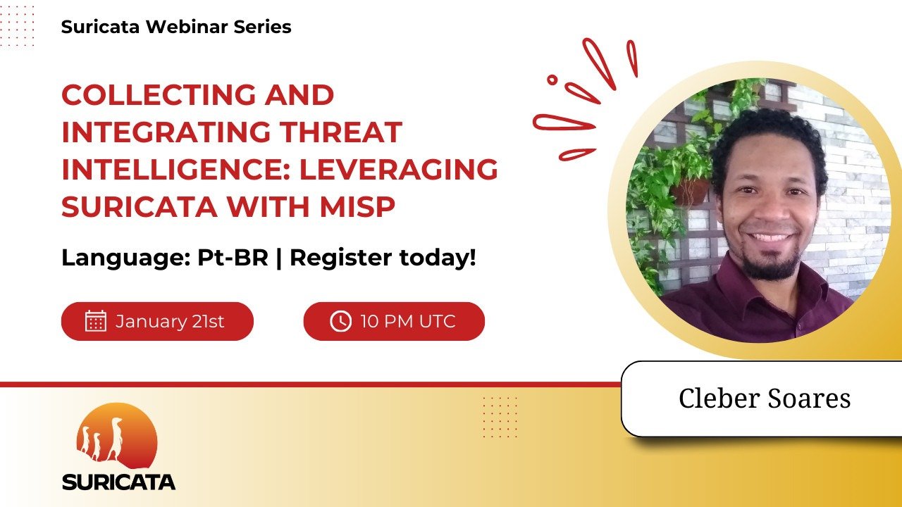A Suricata promove no dia 21 de janeiro, às 10h UTC (19h horário de Belém), um webinar gratuito sobre “Collecting and Integrating Threat Intelligence: Leveraging Suricata with MISP”.